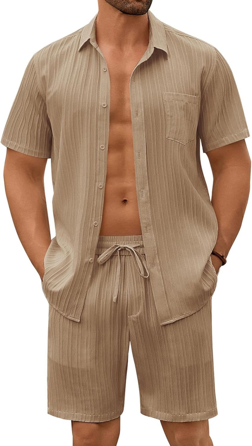 - EASY CARE: This textured 2 piece set is machine washable. NOTE: Package contains 2 pieces – a short-sleeved shirt and a pair of shorts, sold together. Elevate your casual wear style with this comfortable and stylish set!