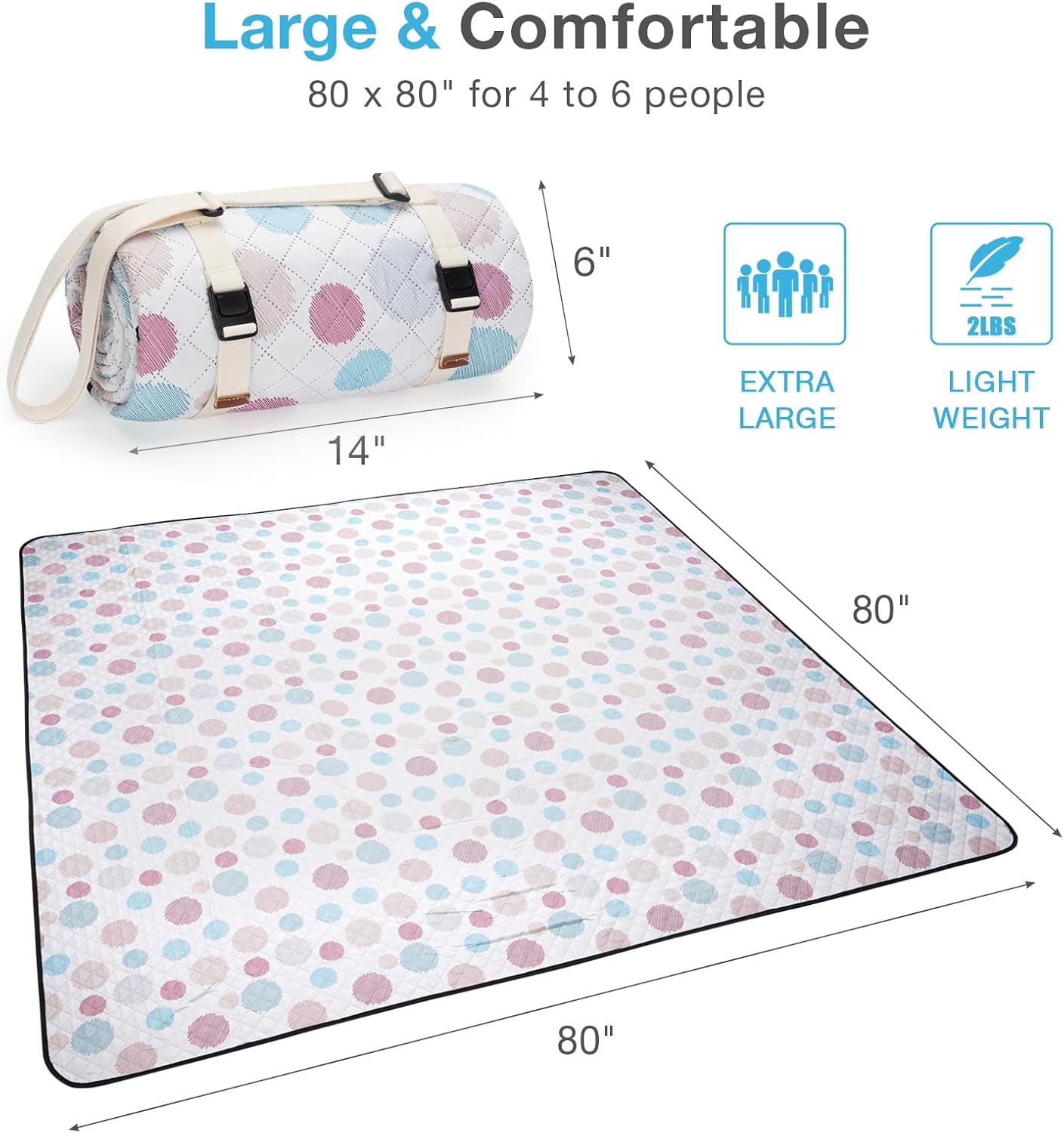 - EXTRA LARGE PICNIC BLANKET: The picnic blankets extra large measure 80 x 80 “, large enough for 7-8 people to sit or 3-4 people to lie down. The picnic blanket is a must-have for outdoor picnics, going to parks, lakes, beaches, camping and hiking, and also a great gift choice for family members and friends